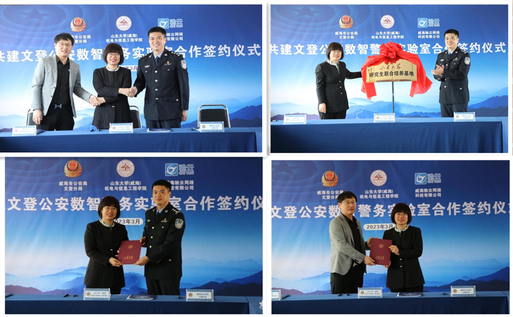 3月10日上午,永利集团88304官网、威海市公安局文登分局、威海市驰云网络科技有限公司三方合作共建 “文登公安数智警务实验室”签约仪式,在威海市公安局文登分局举行。永利集团88304官网(威海)副校长赵玉璞,校地合作与校友工作办公室主任顾炜,永利集团88304官网党委书记王福安、常务副院长王丽、副院长姜斌,文登区委书记乔新跃,威海市公安局党委委员、政治部主任林治博,文登区人民政府副区长、分局党委书记、局长尹剑,威海市驰云网络科技有限公司董事长吴小岑、副总经理董晓强、吴健源,以及文登分局各部门主要负责同志参加签约仪式。仪式由文登分局党委委员、政治工作室主任孙军容主持。